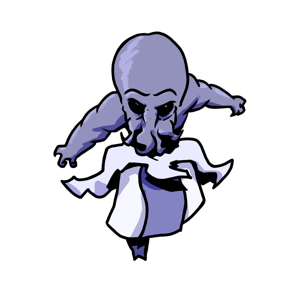 A newly metamorphed mind flayer, still dressed in the clothing they were wearing before they were transformed.